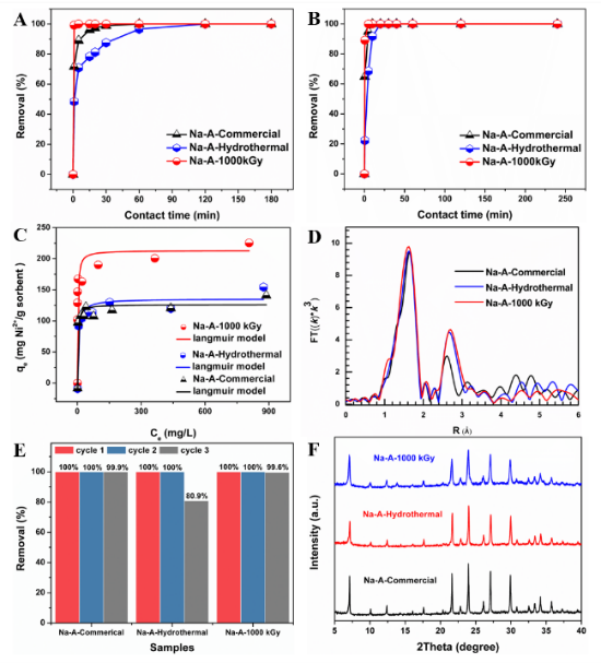 进一步测试了材料对重金属离子Ni2+和碱土金属离子Sr2+的吸附性能,并将其与实验室水热合成的和商业沸石的进行比较。Ni2+吸附实验结果表明,相比于实验室水热合成的Na-A沸石(141.04 mg/g)和商业Na-A沸石(152.90 mg/g),辐射合成的Na-A沸石具有更快的吸附动力学(1 min,由于辐射合成沸石具有更加有利于传质的多级孔结构)和更高的吸附容量(222.22 mg/g),并且显著高于理论吸附容量(120.20 mg/g)。这是由于辐射合成的Na-A沸石中大量的Si-OH缺陷能够作为通过络合配位作用捕获Ni2+的新位点。对于Sr2+,辐射合成Na-A沸石也具有快速的吸附动力学,但吸附容量未提升(由于Sr2+一般不发生配位作用)。对Ni2+重复利用实验表明,Na-A-1000 kGy样品的吸附性能不受影响,且三轮吸附/脱附后其仍能保持晶型。