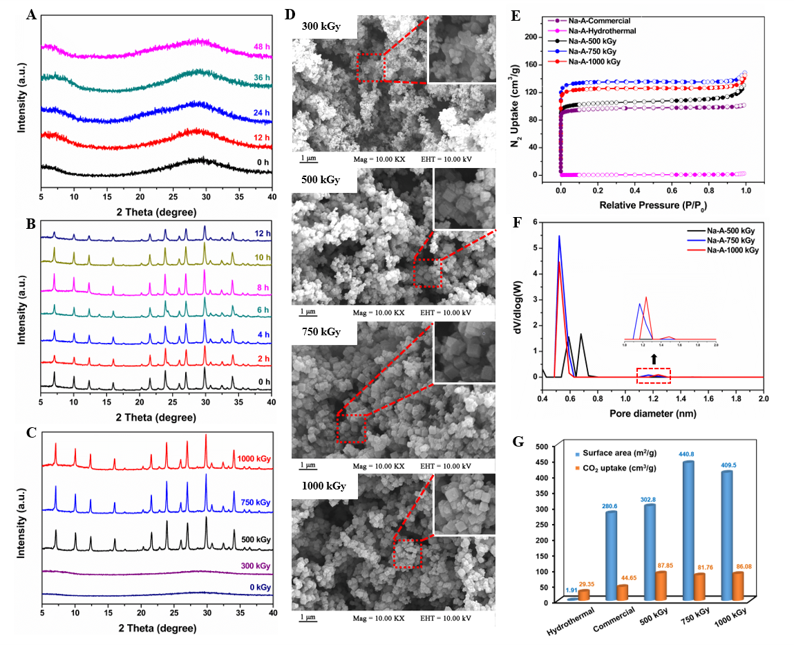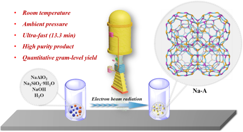 研究团队从沸石分子筛合成方法学入手,使用电子加速器(1.5 MeV)产生的高能电子束作为一种外加的能量源,促进沸石分子筛的合成。在室温常压下,老化后的硅铝酸盐凝胶在电子束下照射13.3 min,制备高度结晶的LTA沸石。相比于传统的水热法,辐射法显著加速反应的结晶速率,并降低近一个数量级的能耗。此外,电子束在沸石形成过程中存在辐射刻蚀效应,从而产生晶体缺陷、形成新的大孔,并且可以通过吸收剂量调控孔径。该方法兼顾高效、快速、绿色等特点,并且具有普适性,分别又合成LTN和SOD沸石分子筛,为沸石分子筛的绿色合成提供一种新路径。更为重要的是,高能电子束辐射合成的沸石分子筛在气体吸附及重金属去除方面相比于水热合成的样品具有显著的性能优势。