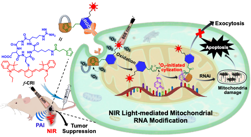 在前期研究中,史海斌教授课题组意外发现了红光调控探针以共价键形式修饰癌细胞内RNA分子可有效抑制肿瘤生长的新现象(J. Am. Chem. Soc. 2020, 142, 21502-21512、J. Am. Chem. Soc. 2022, 144, 23061-23072),但具体的生物学机制尚不清楚。在最新研究中,为了进一步提高上述体系的肿瘤特异性及治疗精准性,该课题组发展了一种近红外光响应的肿瘤线粒体RNA反应型探针f-CRI,并成功用于小鼠乳腺癌肿瘤的近红外/光声长时程成像及治疗研究。该探针由avβ3整合素特异性结合环肽Arg-Gly-Asp-Cys-Lys、近红外荧光团IR780以及用于化学修饰RNA的呋喃基团三部分组成。由于IR780带正电荷,故探针具有良好的线粒体靶向性。当探针靶向进入到肿瘤细胞并蓄积于线粒体后,利用808 nm激光照射肿瘤局部,可引发光敏剂IR780产生大量1O2,从而触发呋喃与线粒体内RNA的碱基发生共价环合反应,致使探针长时间滞留于肿瘤组织,用于肿瘤的长时程近红外/光声双模态成像。更重要的是,探针对肿瘤细胞线粒体RNA (mtRNA)的化学修饰可以干扰线粒体的正常转录和反应功能,诱发肿瘤细胞发生凋亡,进而显著抑制了活体肿瘤的生长。基因组测序结果显示,大量跟线粒体、肿瘤或凋亡通路相关的基因水平发生了不同程度的上调或下调,这可能是导致肿瘤增殖抑制的主要原因。总之,该工作发展了一种更为精准高效的肿瘤线粒体RNA化学修饰新方法,为开展肿瘤RNA干扰治疗研究提供了新思路。