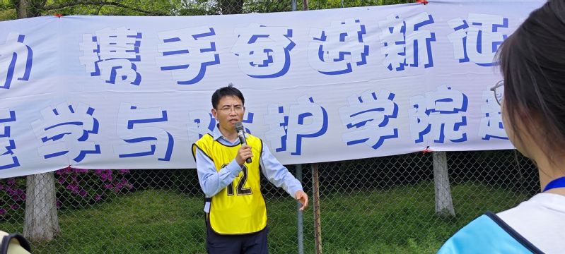 花风摆脱老红去,谷雨将迎稚绿来。恰逢谷雨,蓝天白云,足球场上芳草茵茵。一年一度的趣味运动带领大家一起“趣”往春天!放射医院与防护学院党委书记王成奎致开幕词,他强调本次比赛友谊第一,比赛第二,希望学院师生能合作共赢,奋勇争先,并预祝本次运动会圆满成功。