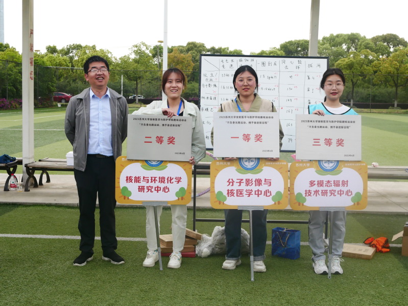 在欢笑声和喝彩声中,本次趣味运动会落下了帷幕。放射医院与防护学院的朱巍老师分别为团队一二三等奖的队伍进行了颁奖,并表示希望大家再接再厉,将运动中的活力与友谊延续到日常科研生活中。