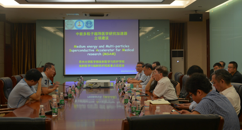 会议由柴之芳院士主持,柴院士首先向来访专家表示热烈欢迎,并就我们正在研制的中能多粒子超导医学研究加速器作了简要介绍。随后周光明副院长就中能多粒子超导医学研究加速器的研制背景、拟解决的主要科学问题、主要设计方案以及可能产生的社会效益等作了详细报告。杨辉主任和景震强副主任在认真听取报告后对我院正在进行的中能多粒子超导医学研究加速器研制工作表示充分肯定,认为中能多粒子超导医学研究加速器的研制对于填补世界相关领域的研究空白、深化重离子治癌基础研究、推动重离子束在空间科学和材料科学领域的应用以及打造苏州城市名片具有重要意义。此外,双方就国重室的组织架构、中能多粒子超导医学研究加速器建设进展以及与姑苏实验室可能的合作方式等问题进行了深入友好的交流。