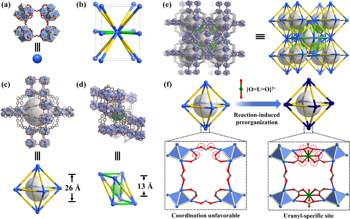 图1. SCU-16、SCU-16-U的晶体结构及反应诱导预组织策略。(a) [Th24O32(HCOO)6]簇和(b) L连接体的拓扑简化,[Th6O8]以多面体模式表示;(c) SCU-16中的正八面体笼和(d)畸变八面体笼;(e) SCU-16的晶体结构和拓扑表现;(f)反应诱导的铀酰特异性结合预组织位点。结合位点用红色虚线圈标出,表示母体SCU-16(左)和嵌入铀酰的SCU-16-U(右)的结构比较。
