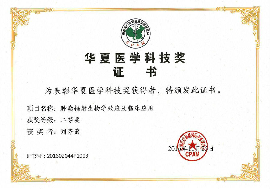 我院刘芬菊教授获得华夏医学科技奖二等奖“肿瘤辐射生物效应及临床应用”