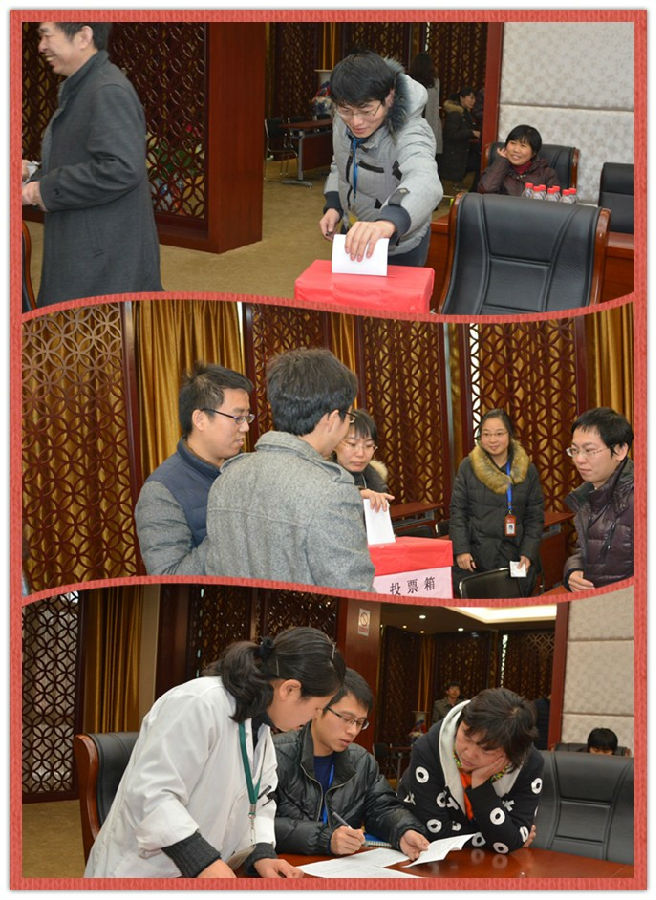 根据《中国共产党章程》、《中国共产党基层组织选举工作暂行条例》规定和上级党组织指示,2014年12月24日下午,我院党委召开教工党支部换届选举大会。大会由学院党委书记曹建平主持,应到党员人数39人,实到33人,有选举权人数32人。会议议程分成三部分:上届支部工作总结、换届选举、支部委员分工。
