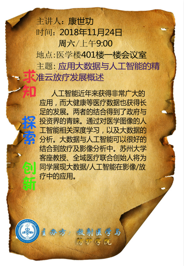 放医学院2018年秋季第二课堂预告(应用大数据与人工智能的精准云放疗发展概述)