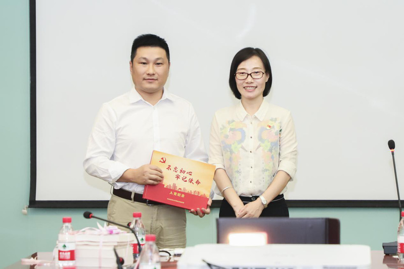 校党委组织部副部长刘慧向杨凯同志赠送入党纪念册并宣读校党委江涌书记的亲笔寄语:“弘扬‘两弹一星’精神,发挥先锋模范作用”。