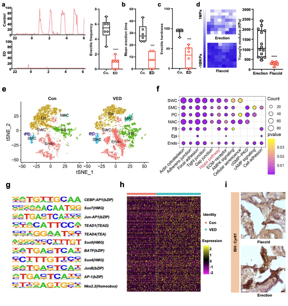 正常成年男性的夜间阴茎勃起(NPT)是评估勃起功能的重要指标。正常男性在睡眠中平均会有3至5次夜勃,持续时间长达3小时。而ED患者则完全没有夜间阴茎勃起的现象,并伴随着阴茎组织中平滑肌和血管数量的减少以及组织萎缩(图1a-d)。基于这个临床和生理现象,作者试图探索其中的生物学意义。阴茎勃起时,海绵体平滑肌舒张,使海绵体动脉不再受到压迫,同时阻塞周围的静脉回流(静脉阻塞),血液能够填充海绵体腔隙,从而导致阴茎勃起。这一生理过程中,阴茎组织内产生了高力学环境。因此,从生物力学微环境的角度出发,探索勃起功能障碍发生发展的机制,特别是那些无法通过PDE5抑制剂治疗的患者是本研究的核心科学问题。