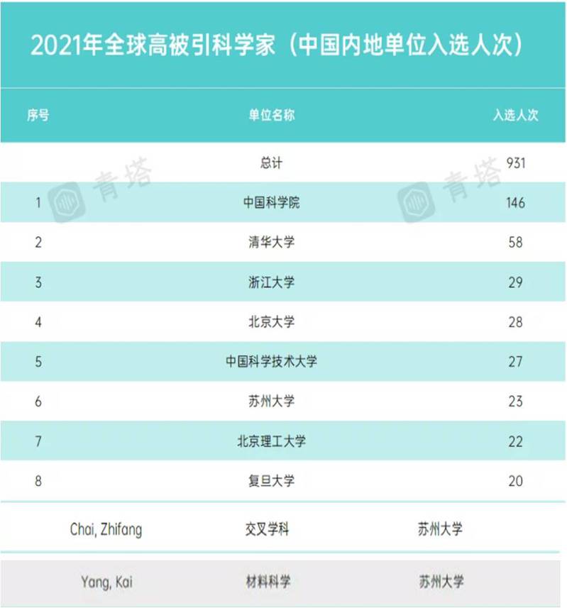 2021年度,中国科学院入选科学家数量依旧排名全球机构第2位,清华大学位列全球机构第8位,这是清华大学继2019年排名第19位上升到2020的第9位后,位次再一次上升。从中国内地高校入选数统计来看,清华大学位居首位,达58人次;浙江大学共有29人次入选,紧随其后;北京大学和中国科学技术大学各有28和27人次入选,表现不俗。苏州大学有23人次,位居第六。
