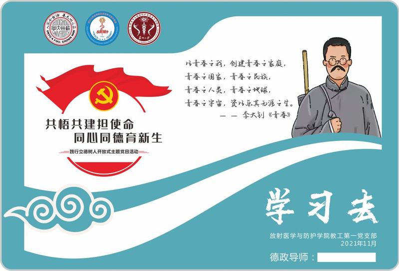 活动初始,曹建平常务副院长给予致辞,介绍了学校及学院坚持贯彻落实德政导师制的相关举措,诠释了立德树人工作的本质,并通关自身成长的故事鼓励支部党员教师发挥先锋模范作用,不断通过正面教育来引导、感化、激励学生,为培养适应新时代要求的放射医学优秀人才作出贡献。