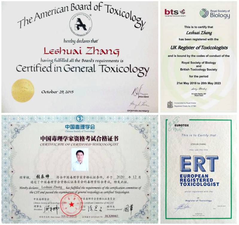 2018年,张乐帅获得了欧洲/英国毒理学家的注册资质。欧洲注册毒理学家(EUROTOX Registered Toxicologist,ERT)是经由皇家生物协会(Royal Society of Biology)授予英国注册毒理学家(UK Registered Toxicologist,UKRT)自动获得的勋衔。ERT是张乐帅在毒理学职业规划及生涯中重要的里程碑,其获得需要具备诸如DABT资质、至少五年的毒理学执业经验,以及数名毒理学人士(至少一名为ERT)的推荐。获得ERT后,每五年需重新注册,需同时在学术与工业界的毒理学领域中积极活动方可保持其身份。