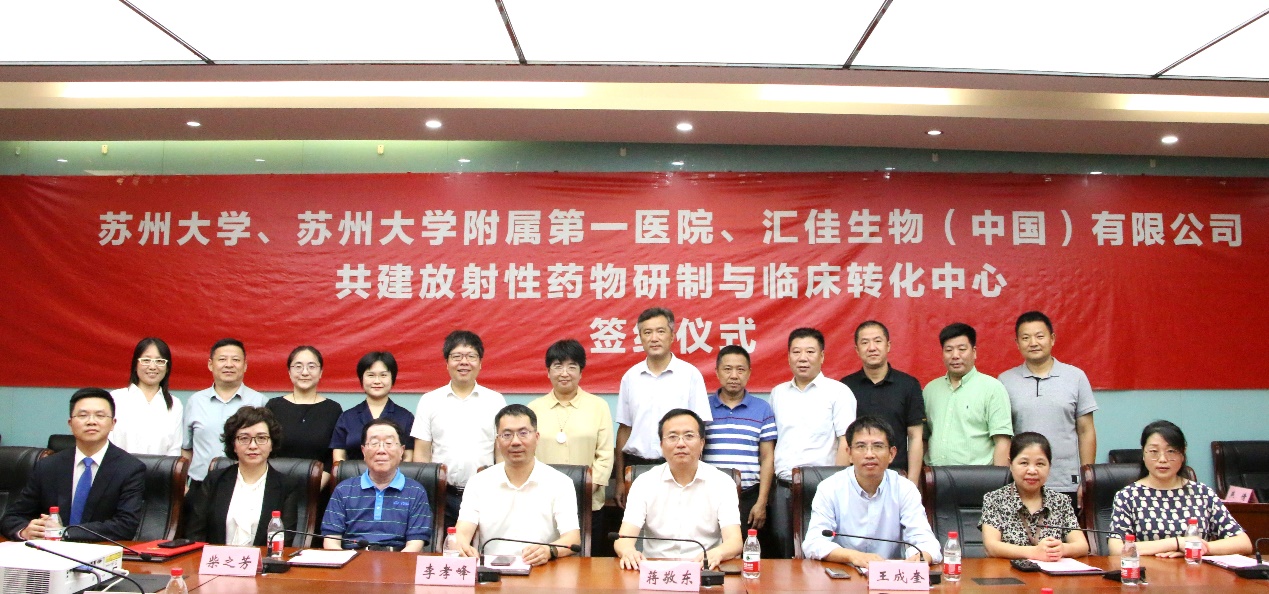 2023年8月5日下午,苏州大学、苏州大学附属第一医院、汇佳生物(中国)有限公司共建放射性药物研制与临床转化中心签约仪式在苏州大学独墅湖校区医学楼一楼会议室成功举行。出席签约仪式的有苏州大学党委常委、副校长李孝峰,苏州医学院放射医学与防护学院院长柴之芳院士,苏州大学附属第一医院常务副院长、药物研究与转化交叉研究所所长缪丽燕;汇佳生物(中国)有限公司董事长兼CEO张阳、副总裁姜海霞;苏州大学科技党委书记蒋敬东以及学校相关职能部门领导出席参加;放射医学与辐射防护国家重点实验室主任王殳凹、放射医学与防护学院党委书记王成奎出席;会议由王成奎主持。