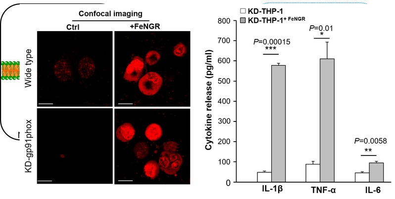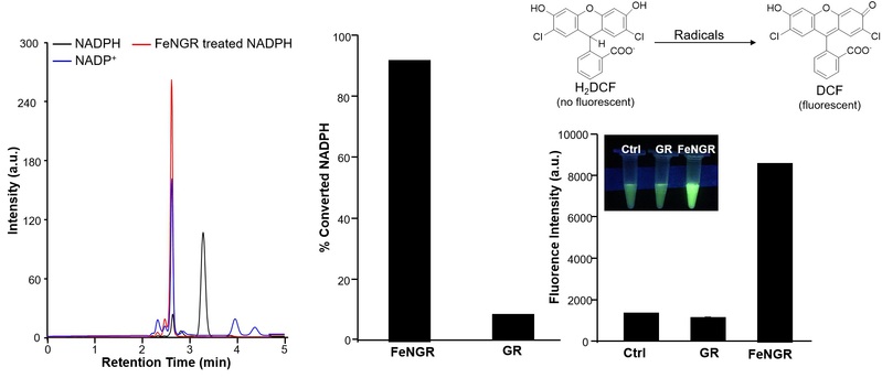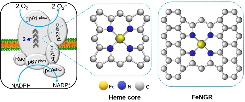 NOX是一种主要在免疫细胞中表达的、具有6个亚基的跨膜复合酶。该复合酶的胞内亚基可以将NADPH转化为NADP+, 通过跨膜区域将电子转移至胞膜gp91phox亚基,利用其血红素活性位点,将O2分子转化为超氧自由基,O2·-是引发细胞内免疫响应的重要起始信号分子。虽然NOX在机体免疫响应中至关重要,但其多亚基跨膜的复杂结构使得NOX难以提取、纯化,目前没有商品化的活性NOX重组酶。针对这一难题,李瑞宾研究团队根据NOX活性位点和电子传递的结构特征,设计合成了Fe-N掺杂的二维石墨烯材料,FeNGR (图1)。研究证实,FeNGR能够将NADPH高效转化为NADP+,同时伴随着氧自由基的生成 (图2),转化率高达93%。相比蛋白酶,FeNGR更加稳定,可以在极端反应体系(pH 1-12,温度4-90℃,0-100%有机溶剂)中保持85%的催化活性。此外,FeNGR可以替代NOX的生物学功能,在NOX缺陷细胞中,催化超氧自由基的生成,并进一步激活下游的免疫信号分子(图3)。近期研究发现免疫因子在机体应对外源性刺激(辐射、环境污染物、微生物)中具有重要的保护作用,FeNGR的免疫保护效应将是未来非常值得探索的一个新方向。综上,该研究首次通过设计人工纳米材料模拟了跨膜复合酶,为人工酶的设计及机体免疫调控提供了新思路。