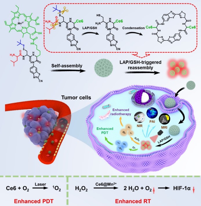 在最新的研究进展中,史海斌教授课题组创新性提出设计并构建了一种亮氨酸氨基肽酶(LAP)和谷胱甘肽(GSH)双重响应且在肿瘤病灶选择性“变形”的新型纳米分子探针,显著增强了药物的肿瘤渗透性与递送效率,实现了高效的肿瘤多模态成像与光动力/放射增敏治疗。该工作中设计合成的小分子探针由于具有两亲性特点,在水溶液中会自发组装成80 nm左右的纳米颗粒。当探针进入肿瘤病灶后,在微环境高表达的LAP酶和GSH的共同驱动下,可促使探针转化为较小的纳米颗粒(~23 nm),显著提高探针的肿瘤穿透能力与富集量,同时激活探针的荧光/磁共振成像信号以及光动力效应,实现了增强的多模态成像引导下的肿瘤光动力治疗。更令人兴奋的是,该纳米探针螯合了Mn2+ (Ce6-Leu@Mn2+)后,还具有较强的催化乏氧肿瘤组织中H2O2转化成O2的能力,进而改善了肿瘤的乏氧环境,有效提高了肿瘤放射增敏治疗的效果。该研究成果为实现高效的恶性肿瘤光动力和放射治疗提供了一种新手段。