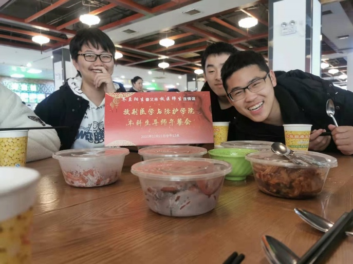 伴随着冬阳,伴随着酒香,伴随着欢声,伴随着教诲,本次午餐会在快乐中拉上帷幕。冬至,是自己与家人团聚的日子,各位“萌新”远在他乡求学,不能与自己的家人相聚,但在放射医学与防护学院,与他乡的家人——他们的导师在冬至日享受着这一顿美美的午餐,分享成长的喜悦。学生与导师如家人般快乐相处、无比温馨。一个简单的午餐会,增进了同学们的友谊,拉近了师生间的距离,让远在他乡求学的学子,感受到了家一般的温暖与幸福。