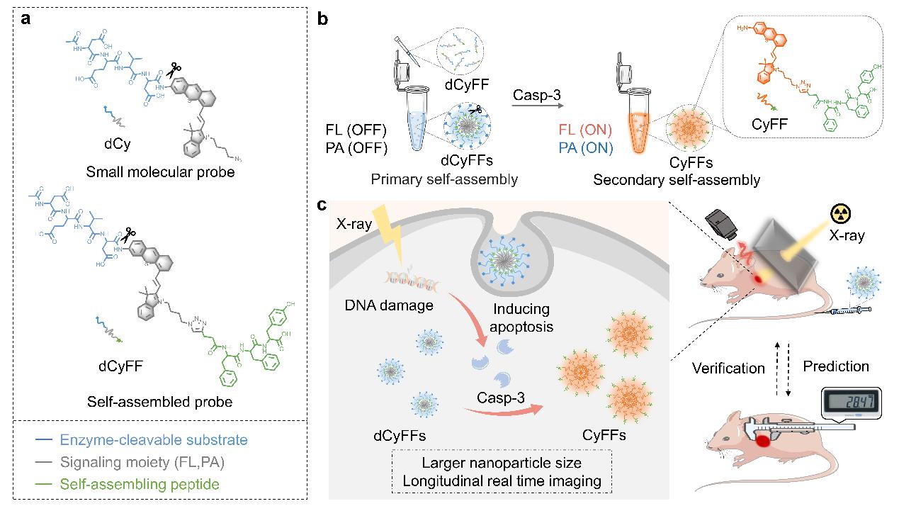 图:自组装荧光、光声探针dCyFF的激活及其放疗评价体系的示意图
