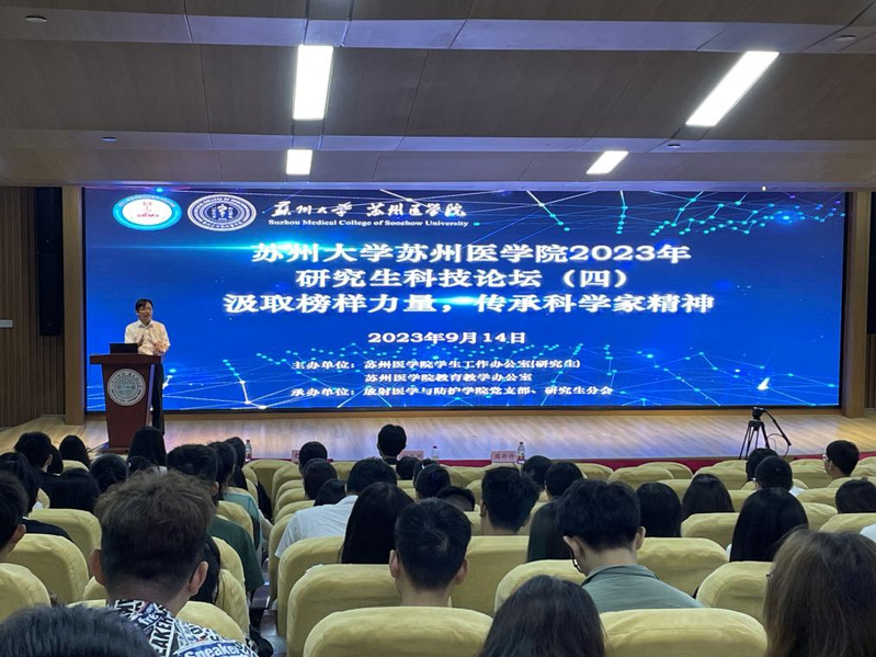 2023年9月14日,研究生科技论坛(四)于独墅湖校区医学楼四楼报告厅举办。本次论坛邀请了放射医学与辐射防护国家重点实验室刘汉洲教授和史海斌教授作为主讲嘉宾,放射医学与防护学院党委书记王成奎、研究生辅导员周丹丹及各学院研究生代表出席本次论坛。论坛由周丹丹主持。