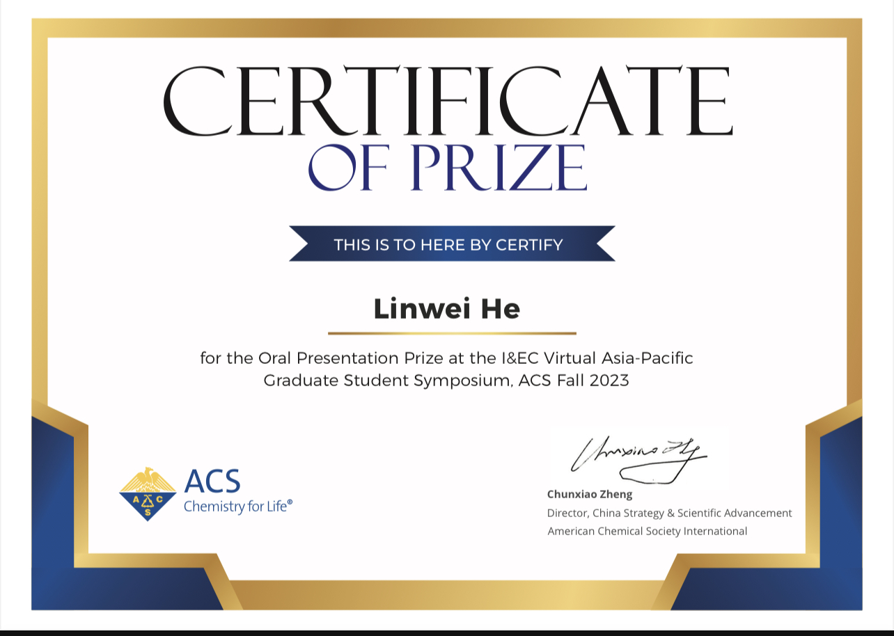 我院博士后何林玮在2023 ACS秋季年会(ACS Fall 2023)荣获优秀报告奖