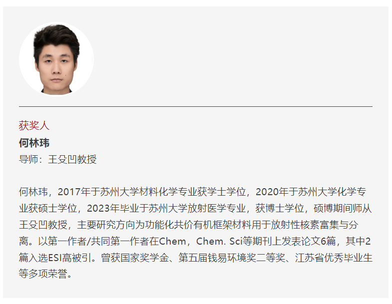 2023年8月21-25日,由美国化学会(American Chemical Society, ACS)举办的美国化学会年会在美国洛杉矶以线上、线下结合的方式顺利召开,本次会议的主题为“Harnessing the Power of Data”。经ACS中国办公室和ACS国际分会推荐和遴选,苏州大学放射医学与防护学院王殳凹课题组的2020级博士研究生何林玮(现为我院博士后)受邀在亚太化工学生分会场(Virtual Graduate Students Symposium in Asia-Pacific Region on Industrial and Engineering Chemistry)做口头报告,该分会场邀请报告均来自中国化工领域优秀课题组的学生,报告题目为《Covalent Organic Frameworks (COFs) for Radionuclides Remediation》,报告内容介绍了通过构筑一系列功能化共价有机框架材料用于放射性核素的高效治理,该工作得到了国内外同行的高度认可与肯定,经评选最终荣获该会场优秀报告奖。指导老师为王殳凹教授。