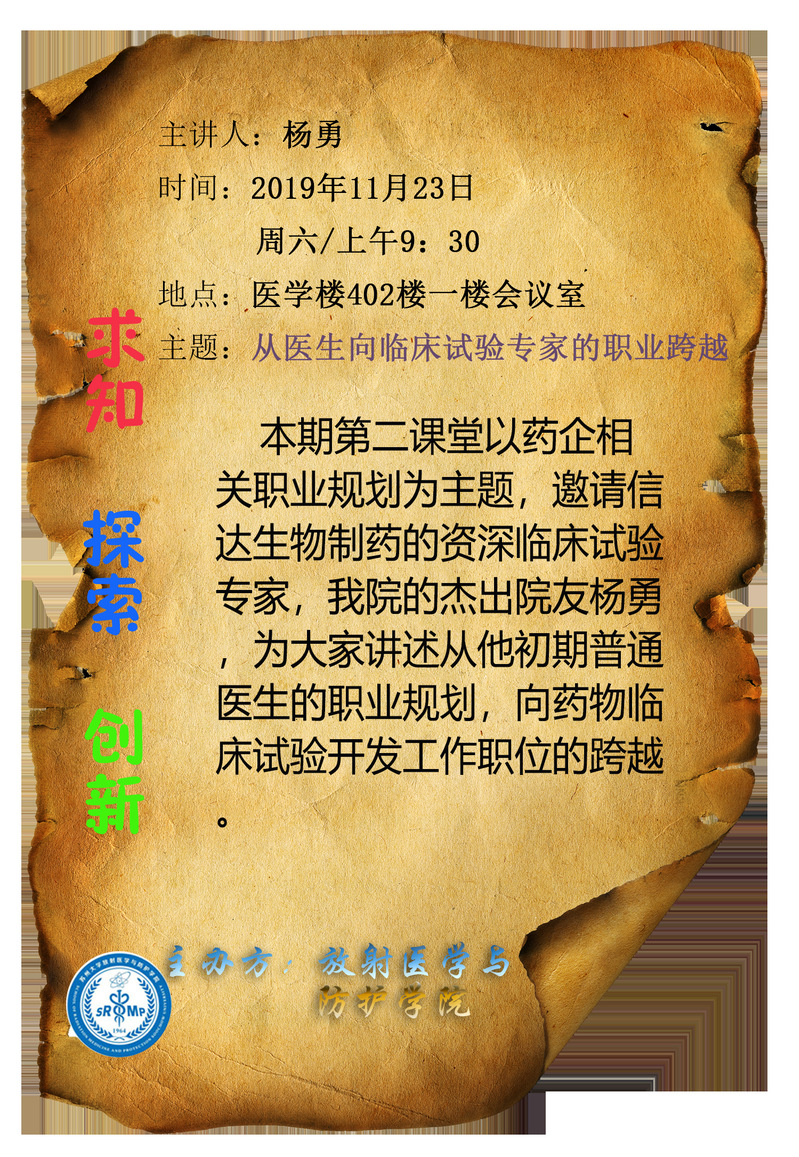 放医学院2019年秋季第二课堂预告(从医生向临床试验专家的职业跨越)