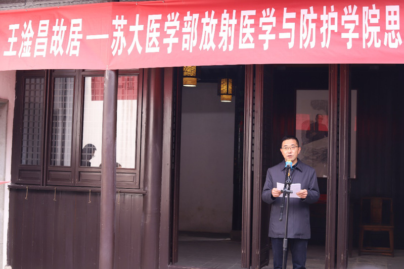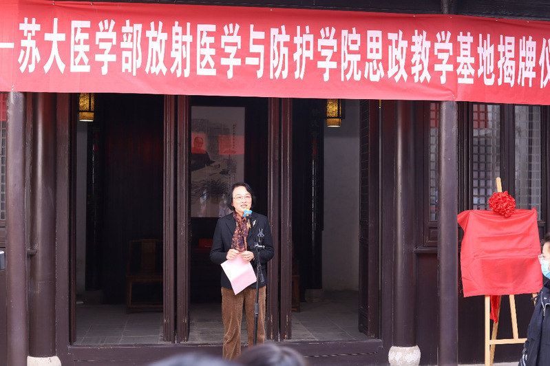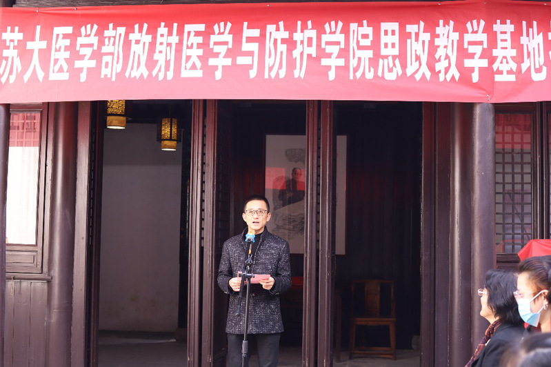 蒋星红副校长在致辞中强调苏州大学高度重视把培育和践行社会主义核心价值观融入教育教学全过程,近年来全面推进课程思政建设,把价值观引导于知识传授和能力培养之中,帮助学生塑造正确的世界观、人生观、价值观。蒋校长代表苏州大学感谢支塘镇党委和政府的支持和帮助,使我校首家课程思政现场教学基地落地王淦昌先生故居。蒋校长勉励我院师生要肩负历史责任,学习王淦昌先生以身许国的精神,继续传承和发扬“两弹一星”精神和核工业精神,学习新冠疫情以来白衣战士的抗疫精神,努力成为具有国际水平的战略科技人才、科技领军人才,为我国核事业发展、国防建设、肿瘤放疗和核医学做出更大贡献。