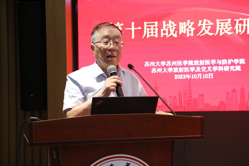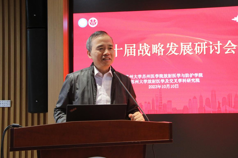 2023年10月10日上午,放射医学与防护学院、放射医学及交叉学科研究院第十届战略研讨会于苏州大学独墅湖校区医学楼四楼报告厅召开。苏州大学党委常委、副校长沈明荣、功能纳米与软物质研究院迟力峰院士、苏州大学学术委员会副主任郎建平、材料与化学化工学部主任张正彪、苏州医学院党工委书记钱福良、苏州大学附属第一医院常务副院长缪丽燕、苏州大学附属第二医院副院长钱志远、基础医学与生物科学学院院长李斌、药学院副院长陈华兵、功能纳米与软物质研究院教授何耀等领导和专家,会议还邀请浙江省肿瘤医院副院长朱骥等嘉宾,学院柴之芳院士和党政班子成员以及全体教职工、博士研究生参加了本次战略研讨会。会议开幕式由执行院长曹建平主持,学术报告分别由周光明副院长和王殳凹副院长主持。