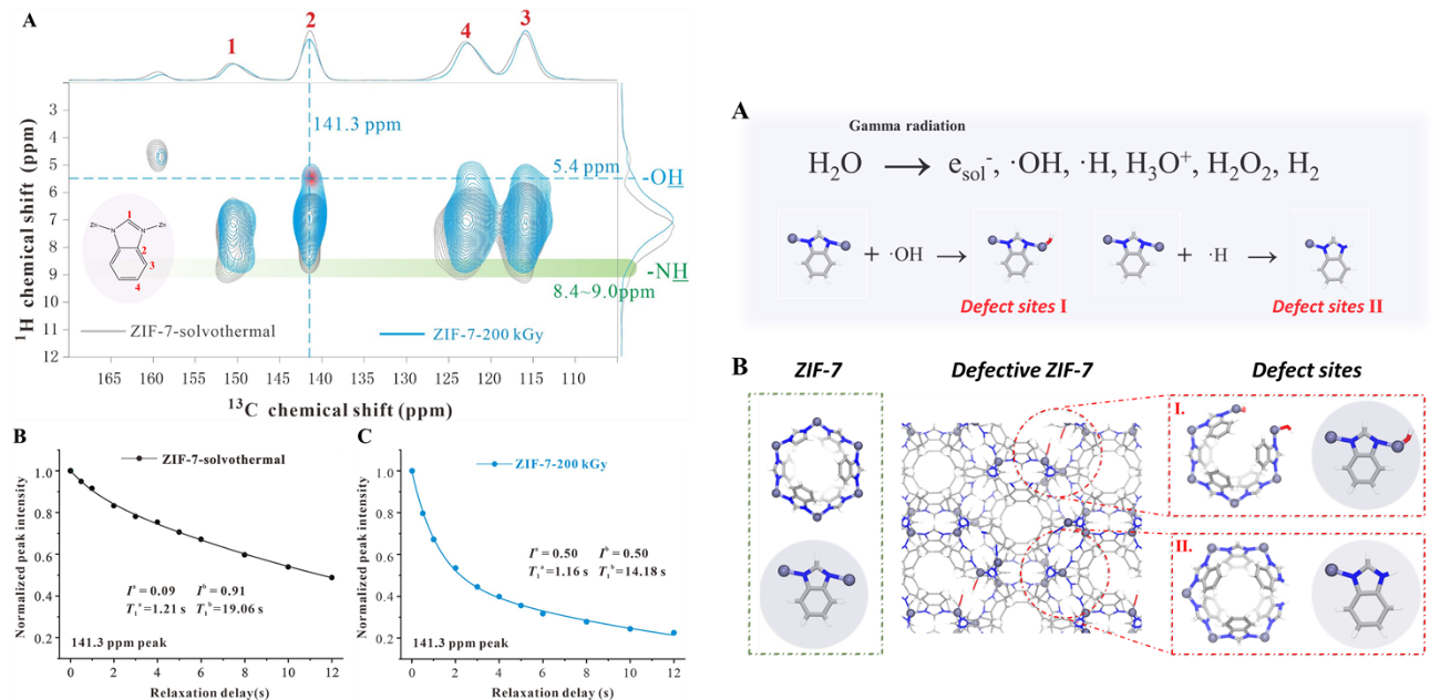 在本工作中,研究团队率先使用工业钴源产生的伽马射线促进ZIF-7的合成。在室温常压下,前驱体溶液在伽马射线照射50 kGy后即可得到高结晶度的ZIF-7材料。同时,伽马射线可以原位刻蚀ZIF-7结构,从而产生晶体缺陷,实现等级孔结构的构筑,提供了一条缺陷MOFs合成的全新路径。通过粉末衍射(PXRD)、固体核磁(MAS-SSNMR)和氮气吸附等测试,对ZIF-7材料进行系统表征。结果显示,辐射合成的ZIF-7材料相较于传统水热合成的ZIF-7材料具有更高的结晶度和比表面积。此外,可以进一步改变吸收剂量调控合成材料的富缺陷程度。通过二维1H-13C固体异核化学位移二维谱(HETCOR)、X射线光电子能谱(XPS)和X射线吸收精细结构谱(XANS)确定了ZIF-7中-NH和-OH缺陷的存在形式。通过13C自旋晶格弛豫时间,半定量地表征样品体系中基团的局部运动性,确定了ZIF-7-200 kGy和ZIF-7-solvothermal中的缺陷含量。同时,通过三维电子衍射和原位高分辨透射电镜表征证明了辐射合成ZIF-7材料中的缺陷为无序缺陷,结构与常规溶剂热合成相同。