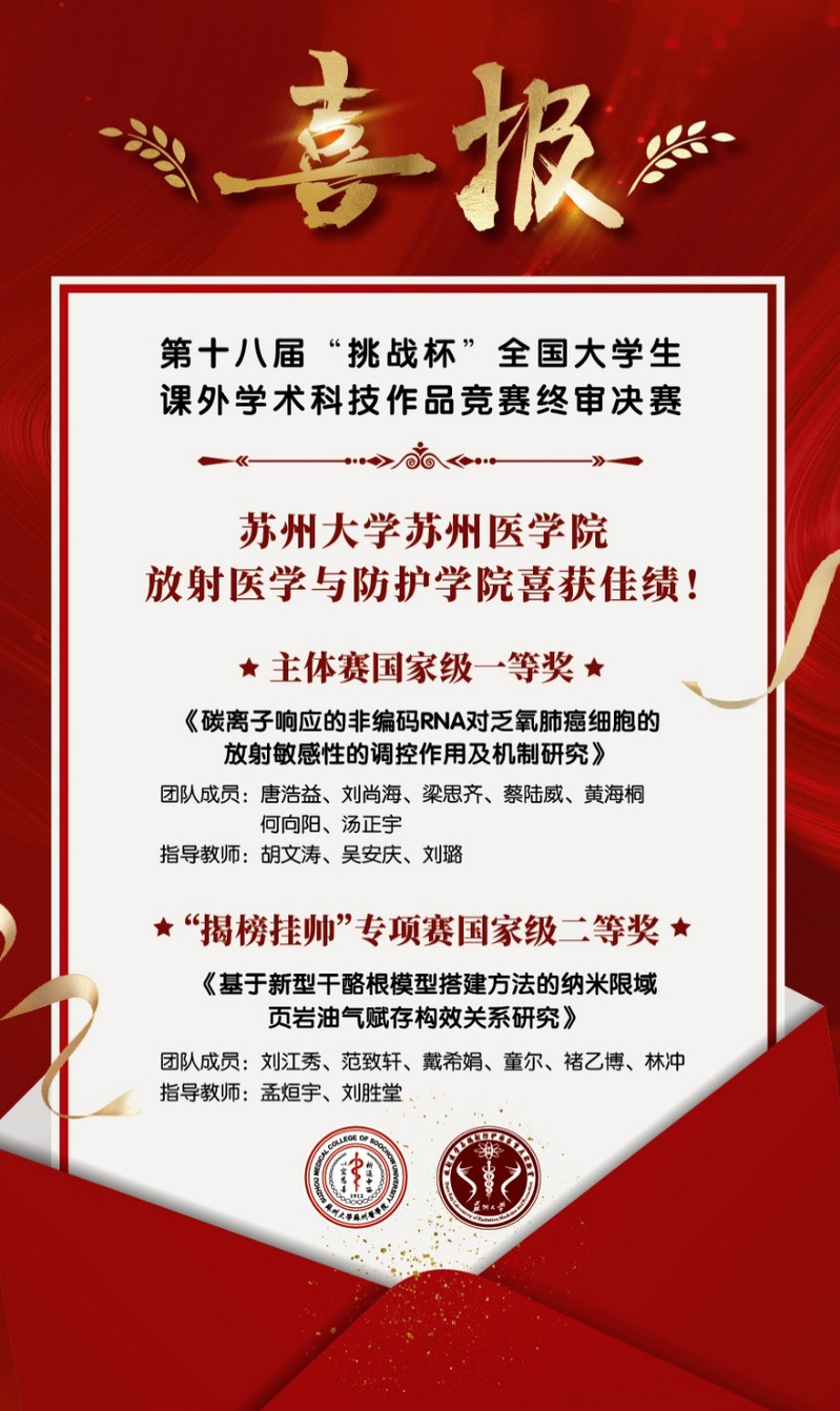 2023年10月27日至31日,第十八届“挑战杯”全国大学生课外学术科技作品竞赛终审决赛在贵州大学隆重举行。我院由胡文涛老师与孟烜宇老师等老师指导的两支参赛队伍分别获得主体赛国家级一等奖与“揭榜挂帅”专项赛国家级二等奖。“挑战杯”全国大学生课外学术科技作品竞赛是中国最具代表性、权威性、示范性、导向性的大学生竞赛之一,被誉为大学生科技创新创业的“奥林匹克”盛会。本次获奖是对参赛师生科研创新与勤奋努力的肯定。未来,我院将继续提升教学科研工作水平,努力培养更多具有创新精神和实践能力的放射医学拔尖人才。
