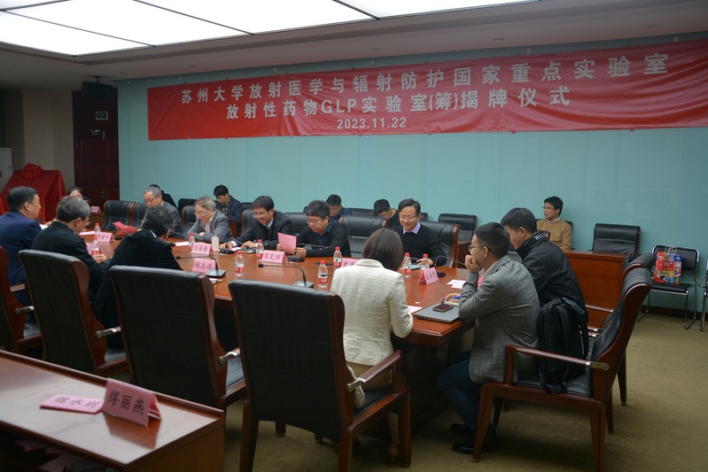 为促进放射性药物创新研发及新药安全评价工作,经党政联席会议研究决定筹建放射性药物GLP实验室。2023年11月22日下午 14:00在独墅湖校区医学楼402幢一楼会议室,苏州大学放射医学与辐射防护国家重点实验室举行放射性药物GLP实验室(筹)揭牌仪式。出席会议的有苏州大学科技党委书记徐小乐,实验室与设备管理处副处长陈美,苏州医学院副院长宋军,苏州大学附属第二医院副院长钱志远,中国辐射防护研究院放射医学与环境医学研究所书记李建国,益诺思生物技术有限公司CEO常艳、总监许波华,苏州苏大卫生与环境技术研究所有限公司总经理田启明、市场总监王向荣,放射医学与辐射防护国家重点实验室名誉主任、放射医学与防护学院院长柴之芳院士,校先进技术处处长、放射医学与辐射防护国家重点实验室主任、放射医学与防护学院副院长王殳凹,苏州医学院放射医学与防护学院党委书记王成奎、执行院长曹建平、副院长史海斌和华道本,以及学院国重室师生等。会议由华道本主持。