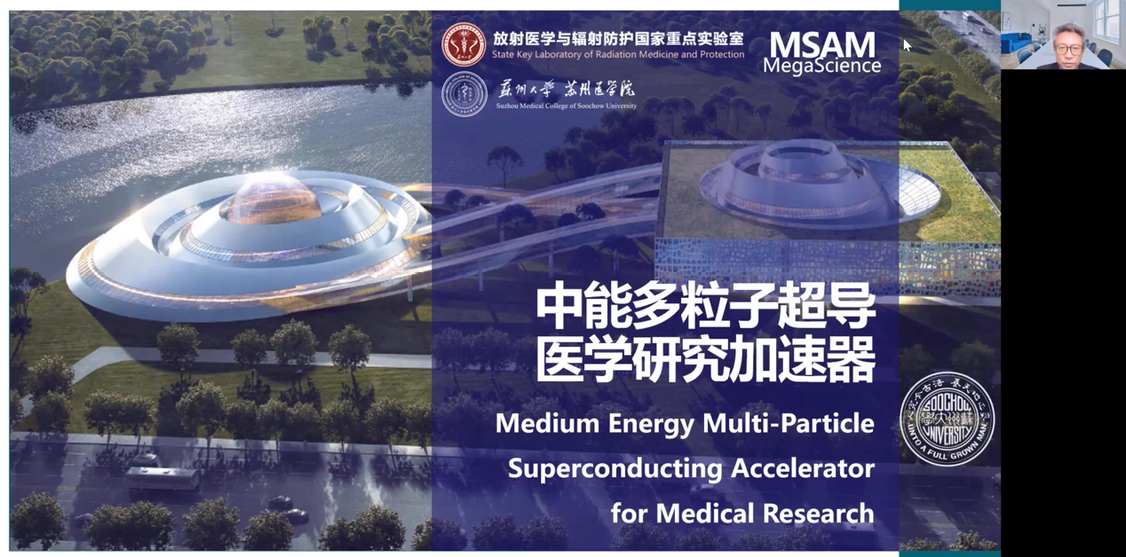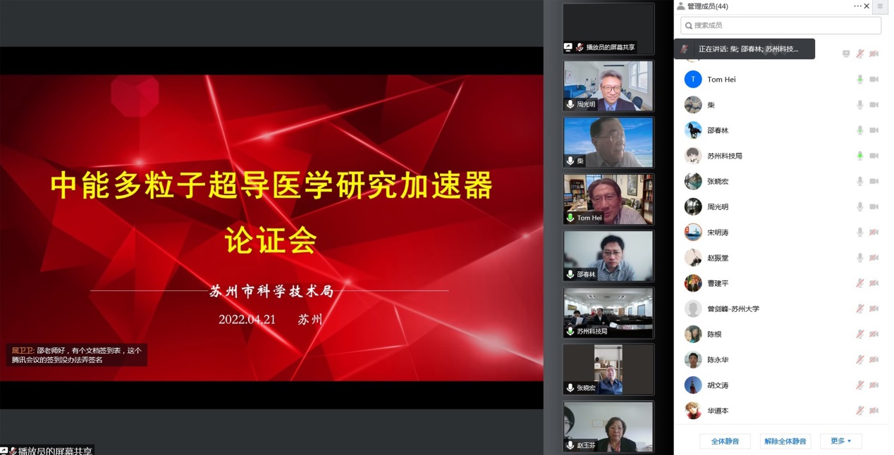 2022年4月21日上午,苏州市科技局组织召开了 “中能多粒子超导医学研究加速器”线上专家论证会。江苏省教育厅二级巡视员张兆臣、江苏省科技厅主任科员张传晖、苏州市科技局副局长顾万勇、处长廖希明、副处长周旭平,昆山市科技局副局长马丽等出席会议;论证会邀请了中科院上海高等研究院赵振堂院士、宁波大学赵玉芬院士、中国科学院合肥物质科学研究院副院长宋云涛、中国原子能科学研究院同位素研究所研究员罗志福、复旦大学放射医学研究所书记邵春林、上海质子重离子医院院长助理孔琳、中科院上海高等研究院主任张满洲、美国哥伦比亚大学放射肿瘤系常务副主任Tom Hei、中国科学院近代物理所研究员宋明涛等国内外加速器及放射医学领域知名专家组成专家组;苏州大学副校长张晓宏、科学技术研究院书记蒋敬东、常务副院长钱福良、科长施雪奎等校及相关职能部门领导,以及放射医学与防护学院院长、国重室主任柴之芳院士、党委书记王成奎、执行院长高明远、常务副院长曹建平、副院长王殳凹和周光明、国重室副主任华道本,及项目组成员等,共60余人参会。会议分别由顾万勇副局长和赵振堂院士主持。