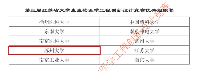 5月29日,由江苏省生物医学工程学会、东南大学主办,徐州医科大学、江苏省生物医学工程学会教育与科普专业委员会承办,徐州医科大学医学影像学院、生物医学工程国家级教学示范中心(东南大学)协办的“第三届江苏省大学生生物医学工程创新设计竞赛”中,我院教师组织并指导学生参加大赛,喜获“优秀组织奖”。