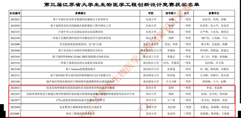 在本届“生物医学工程创新设计竞赛”中,我校“促进实体肿瘤瘤内深部渗透的多功能纳米药物的设计与制备”,“放射性纳米氧发生器通过调节肿瘤微环境和减少肿瘤细胞培养增值以增强抗肿瘤放射免疫治疗疗效”和“177Lu放射性微球的制备及肝癌治疗的研究”三个项目喜获一等奖、“亲水聚苯乙烯微球高效绿色合成技术”和“体外三位微组织培养平台”分别获得二等奖和三等奖。我校赵利、杨凯、王广林老师喜获“优秀指导教师”。