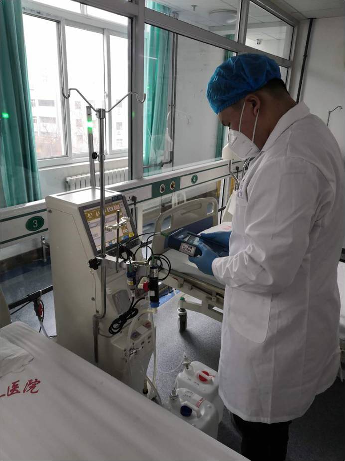 图为中测校准工程师按照涂彧教授要求检测血液透析机(山东省立第三医院)