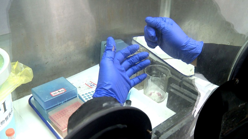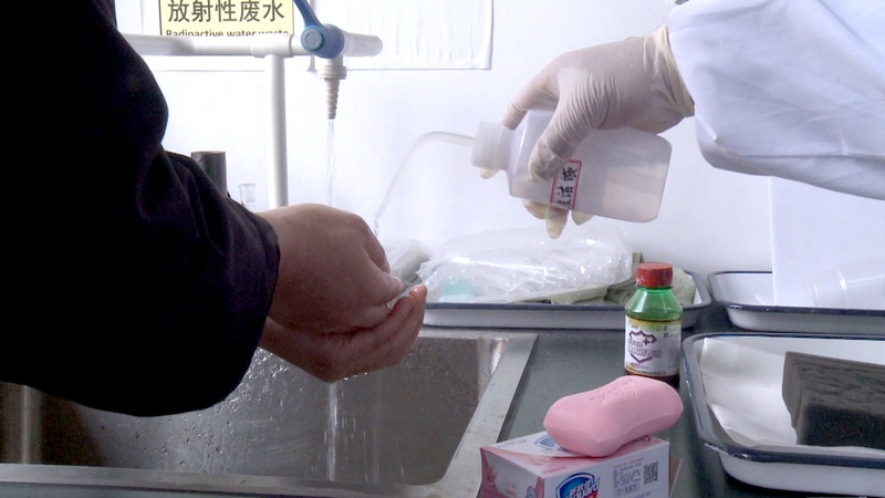 演练首先模拟了放射性核素实验过程中发生手套破裂,造成放射性核素131I沾污到双手的突发状况。