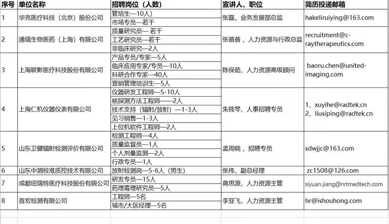 参加本次招聘会的共有八家企业,分别为华克医疗科技(北京)股份有限公司、通瑞生物医药(上海)有限公司、上海联影医疗科技股份有限公司、上海仁机仪器仪表有限公司、山东卫健辐射检测评价有限公司、山东中测校准质控技术有限公司、成都纽瑞特医疗科技股份有限公司、首宏检测有限公司。其中医疗器械机构三家、生物医药相关企业两家、检测鉴定机构三家,工作地点涵盖北京、上海、山东、成都、苏州等地区,共提供硕博就业岗位130多个。