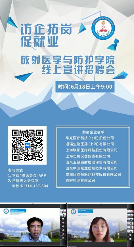 为加强校企合作,推进岗位供需精准对接, 6月18日上午,在放射医学与防护学院举行的线上宣讲招聘会上,放射医学与防护学院党委书记王成奎,为前来招聘的企业单位与学院七十余名硕博毕业生牵线搭桥。会议由放射医学与防护学院研究生专职辅导员朱一丹主持。