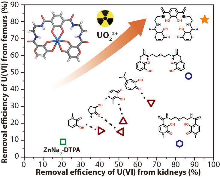 铀是核能的重要原料,在核工业中被大量使用。一旦发生核泄漏事故,铀可能在环境中扩散并通过呼吸道、消化道或皮肤粘膜进入体,随血液循环分布体内各处,最终主要以铀酰离子(UO22+)形式存在并沉积在骨骼和肾脏中。由于铀具有重金属毒性以及长期的放射性,体内沉积的铀酰可导致肾损伤,增加罹患骨肉瘤等疾病的风险。螯合疗法通过使用促排剂与铀酰在体内有效结合并随代谢系统排出体外,可有效降低铀酰对人体的危害,被认为是当前解决这一问题最可行的手段。苏州大学王殳凹教授和第五娟教授团队一直致力于锕系元素配位化学研究,据此设计了一系列高效促排剂,在核应急及辐射防护领域具有良好的应用潜力(Nat. Commun.2019, 10, 2570;Angew. Chem. Int. Ed. 2021, 60, 1646)。由于骨骼中磷酸盐对铀酰的强螯合能力,多数促排剂包括DTPA类临床药物的促排效果尤其是骨骼促排率极为有限,因此铀酰的骨骼促排仍是促排剂研究领域里尚未解决的关键问题。