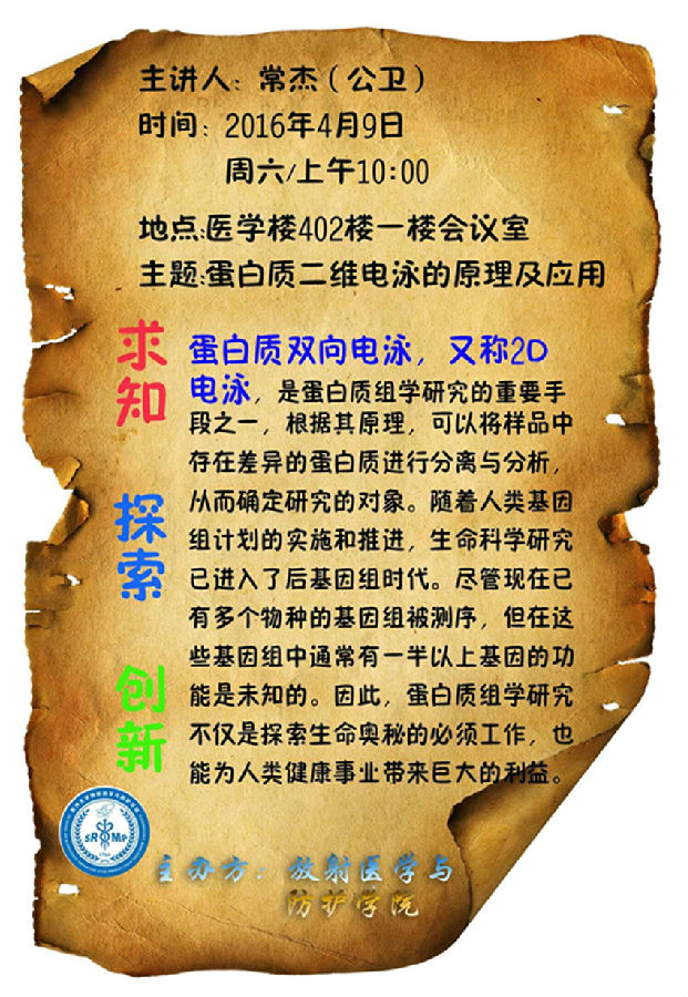 放射学院2016年春季第二课堂预告(蛋白质二维电泳的原理及应用)
