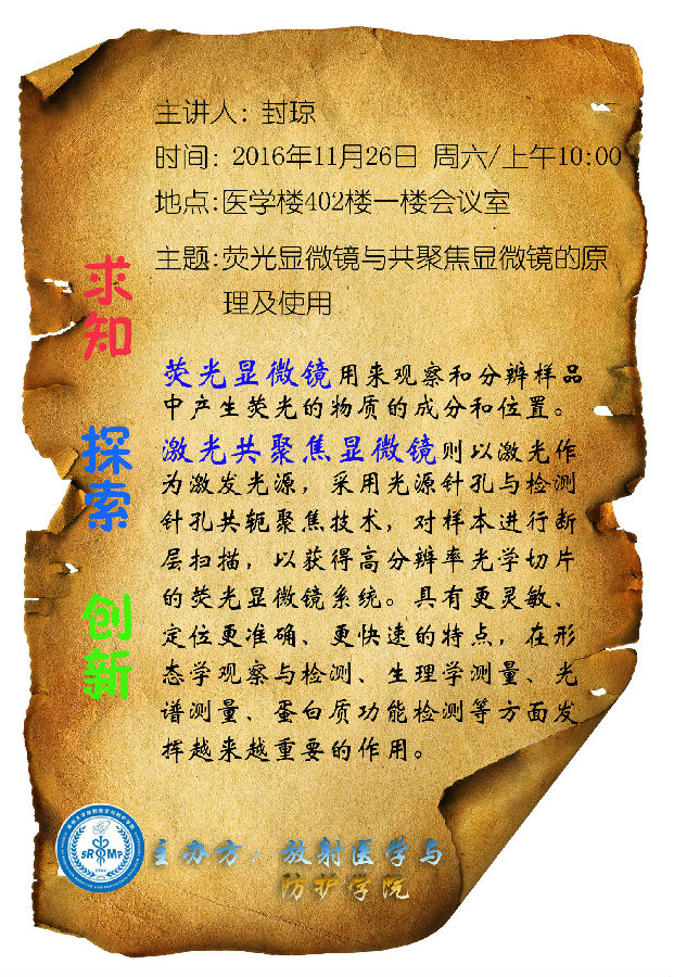 放射学院2016年秋季第二课堂预告(荧光显微镜与共聚焦显微镜的原理及使用)