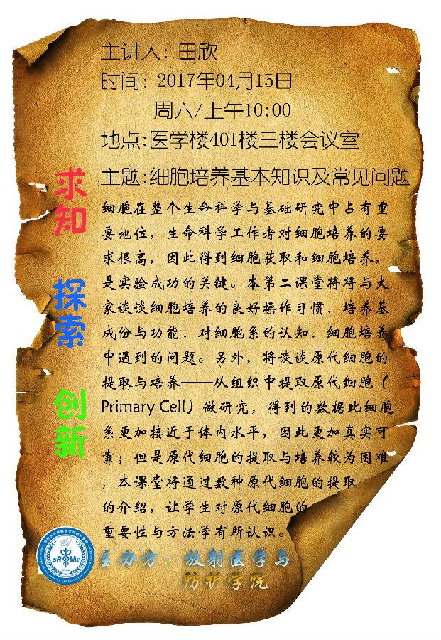 放射学院2017年春季第二课堂预告(细胞培养基本知识及常见问题)