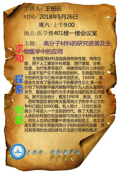 放医学院2018年春季第二课堂预告(高分子材料的研究进展及生物医学中的应用)