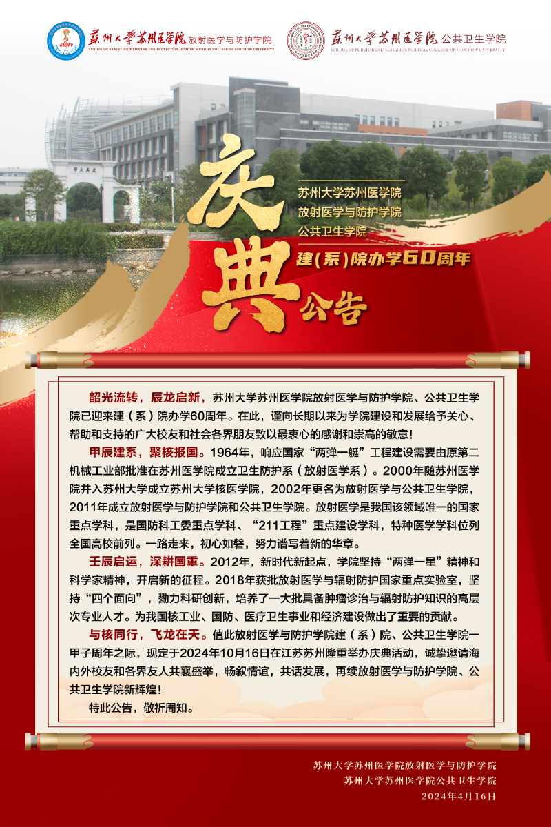 苏州大学苏州医学院放射医学与防护学院、公共卫生学院 建(系)院办学60周年庆典公告(第一号)