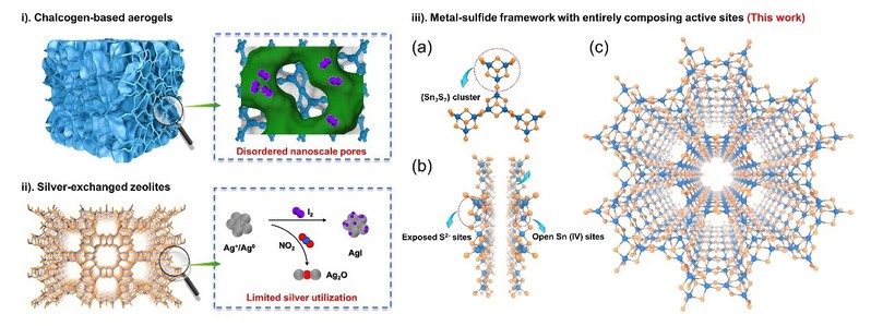图1. 两类传统材料硫基气凝胶(i)和银基沸石(ii)的不足和本工作中锡硫化物材料碘的设计理念与结构示意图