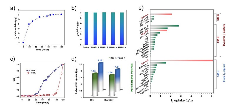 在静态碘吸附实验中,SCU-SnS表现出极高的碘吸附容量,达6.12g/g,是目前已报道的静态吸附容量最高的无机吸碘材料。此外,在高剂量的辐照下,该材料对于碘的吸附容量几乎不变。动态吸附实验证实:在75℃下,SCU-SnS在低浓度碘(400 ppm)穿透实验中表现出对碘长达100小时的阻滞能力,是目前已报道材料中阻滞时间最久的,表明该材料突出的长效深度去除能力。此外,其对于高温(75℃)低浓度碘(400 ppm)条件下的最高吸附容量可达2.12g/g,刷新了目前材料对在该条件下对碘的吸附记录(图2)。