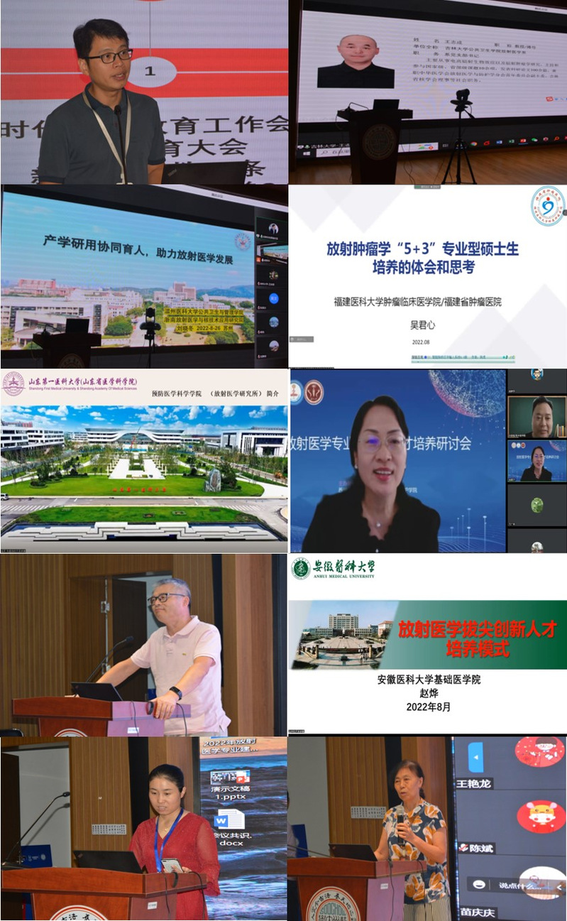 在随后的大会报告中,放射医学与防护学院俞家华副教授介绍了放射医学精英人才培养体系规划,吉林大学王志成教授介绍了“放射生物学”线上线下混合金课建设的探索,刘晓冬教授介绍了温州医科大学的产学研用医协同育人,吴君心教授介绍了福建医科大学放射肿瘤学“5+3”专业型硕士生培养的体会和思考,朱建国教授交流了放射医学本科教学的思考,金顺子教授讲解了对“放射医学”教材体系建设的思考,放射医学与防护学院涂彧教授介绍了放射卫生学一流课程建设,赵烨副教授介绍了放射医学拔尖创新人才的培养模式,放射医学与防护学院李明副教授介绍了放射医学课程思政改革与实践。