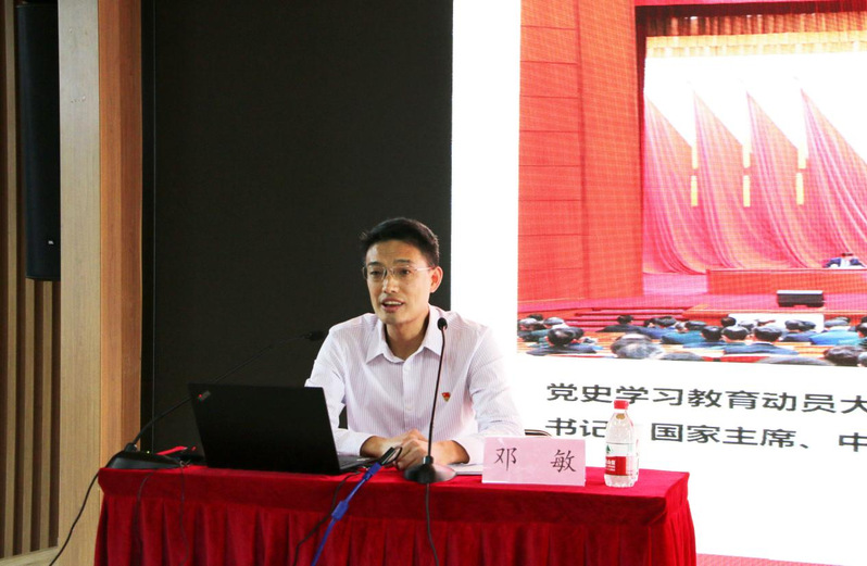 邓敏围绕学习领会习近平总书记在党史学习教育动员大会上的重要讲话精神,用“重大决策、正当其时、必然要求、一件大事”四个关键词深入浅出地阐述了开展党史学习教育的重要意义。围绕中国共产党成立的开天辟地、新中国成立的改天换地、实行改革开放的翻天覆地、奋进新时代的经天纬地四个重要历史时期,结合革命故事与大家一起回顾了中国共产党实现民族独立和人民解放、建立社会主义制和推进社会主义建设、坚持和发展中国特色社会主义及中国特色社会主义进入新时代的百年光辉历程。