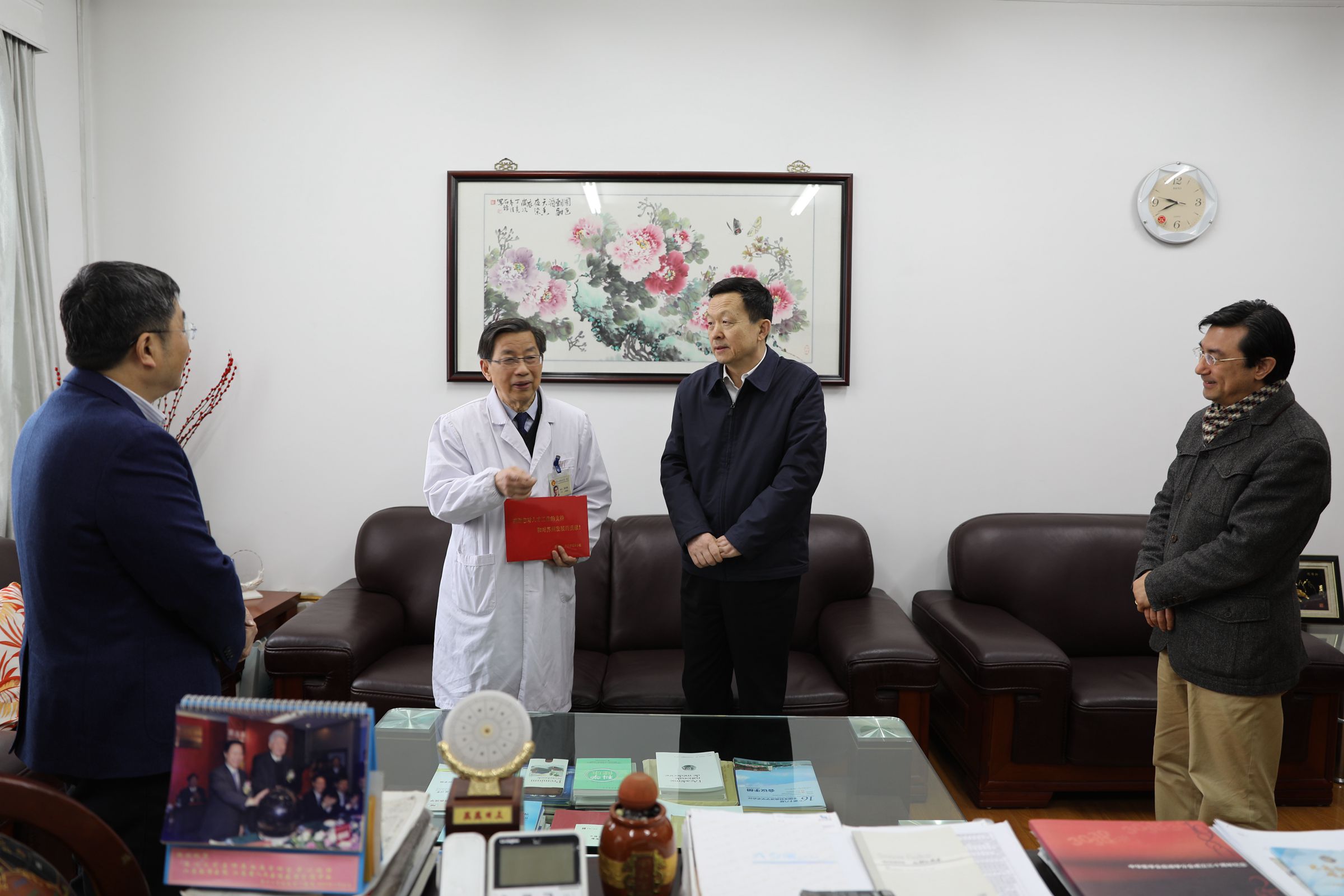 新春佳节临近,2月8日上午,中共江苏省委常委、苏州市委书记周乃翔在我校江涌书记、熊思东校长的陪同下,亲切看望慰问了我校阮长耿、柴之芳院士,感谢他们长期以来为苏州改革创新发展作出的卓越贡献,并致以诚挚的节日问候。 在阮长耿院士的办公室,周乃翔书记亲切询问了阮长耿院士的生活情况,以及医疗科研工作进展。在得知阮院士年近八旬依然坚持在办公室和实验室辛勤忙碌,周书记对他所取得的科研硕果和潜心研究的精神表示高度赞赏。在交谈中,阮院士表达了对市领导关心关怀的感谢,并表示将继续坚守科研一线、发挥示范引领作用,努力在血液病学研究领域寻求新突破,为苏州乃至全国的医疗卫生事业发展贡献智慧力量,为百姓健康服务。