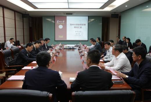 江涌书记随后主持召开了苏州大学改革发展情况汇报会。会上,熊思东校长从学校概况、近年工作、未来展望三方面汇报了学校改革发展的总体情况,并就人才培养、队伍建设、科学研究、社会服务、国际合作等方面改革举措与改革成效进行详细介绍。他表示,苏州大学将按照“顶天立地”的发展思路,把握国家“双一流”和江苏高水平大学建设机遇,推进与苏州“名城名校融合发展”战略,办好人民满意、国际认可、世界尊重的大学。副校长蒋星红以《深化医学教育改革培育一流医学人才》为题,详细汇报了我校医学教育改革发展总体情况。她表示,未来苏州大学将充分发挥学科优势,坚守立德树人本位,深化医教协同发展,持续推进学科交叉融合,不断深化医学教育改革,努力办好综合性大学一流医学教育。