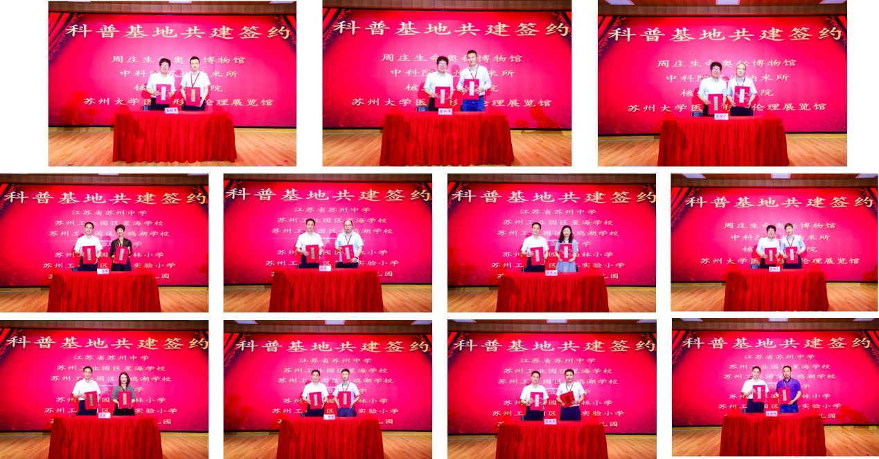 开幕式上,王殳凹教授代表国重室与周庄生命奥秘博物馆、苏州工业园区青少年活动中心、中国科学院苏州纳米技术与纳米仿生研究所、核工业总医院、苏州大学医学形态伦理展览馆等5家单位签约共建共享科普资源;华道本教授代表国重室与江苏省苏州中学伟长计划实验部、苏州工业园区星海实验中学、苏州工业园区金鸡湖学校、苏州市立达中学(初中)、翰林小学、苏州工业园区第二实验小学、翰林幼儿园等7家学校签约,开展科普合作共建基地。