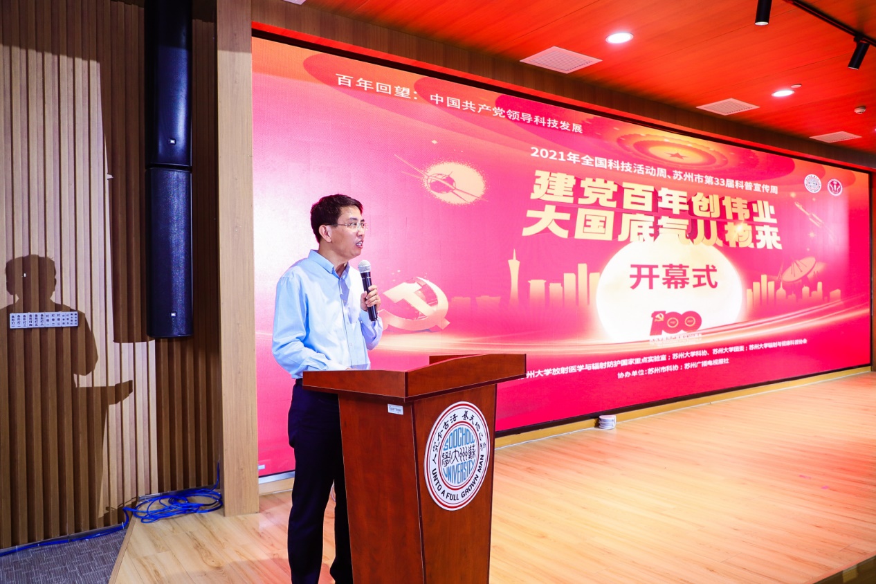 在第五个“全国科技工作者日”到来之际,由苏州大学放射医学与辐射防护国家重点实验室主办的“2021年全国科技活动周暨国家重点实验室开放日活动”开幕式于5月30日上午在苏州大学独墅湖校区举行。江苏省科协科普部三级调研员范正银,苏州市科协科普部部长吴英宁,苏州市科协广播电视报记者金小花,太仓市科协普及部部长黄乐,苏州大学国际合作交流处处长、放射医学与防护学院副院长王殳凹,学院党委书记王成奎,放射医学与辐射防护国家重点实验室副主任华道本等领导出席活动。放医学院党支部师生和本科生等参加活动。开幕式由王成奎主持。